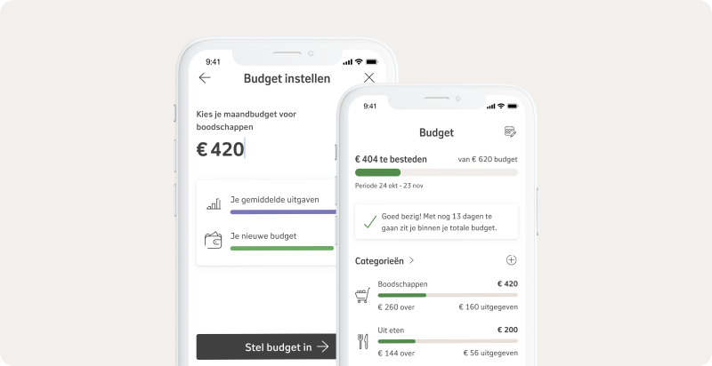 Met budgetteren houd je eenvoudig grip op je uitgaven. Stel per categorie, zoals boodschappen of uit eten, een bedrag in dat je maximaal wilt uitgeven. NN Inzicht houdt je uitgaven automatisch bij en geeft je een seintje wanneer je op de helft zit of bijna aan je limiet bent. Zo weet je precies waar je staat en kom je niet voor verrassingen te staan.