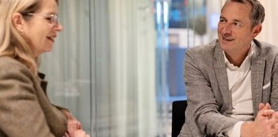 Maurice Koopman (CEO Schade & Inkomen) in gesprek met Petrouschka Werther (Ministerie van Infrastructuur en Waterstaat)